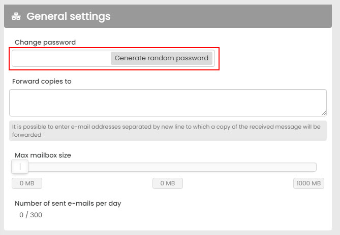 After logging in to the hosting services administration, you'll see various sections for configuring the email mailbox. We are interested in the first section for changing the password.