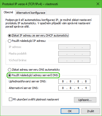 We mark the Use the following DNS server addresses option and now fill in the IP addresses of the selected DNS servers in the active fields Preferred DNS server and Alternate DNS server.