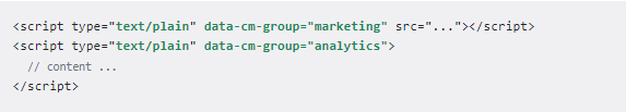 You need to change the type attribute to text/plain and add the data-cm-group data attribute with the group type at which the script should be activated. Available groups are: