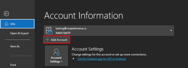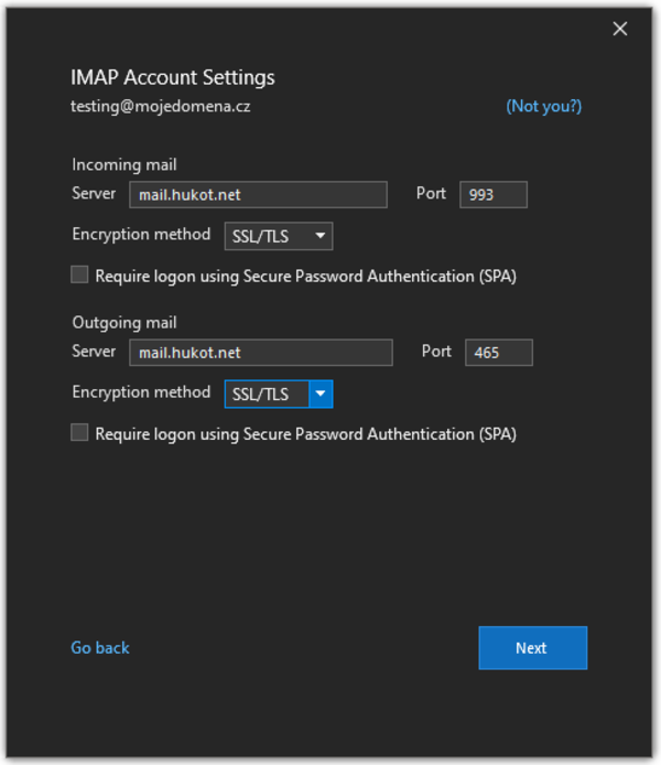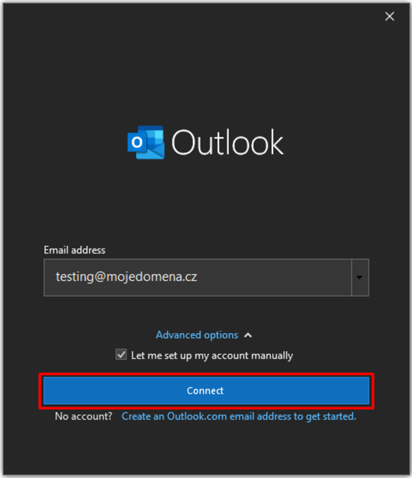 Enter your e-mail address, e. g.: testing@mojedomena.cz, click on "Advanced options" and check "Let me set up my account manually", click on "Connect".