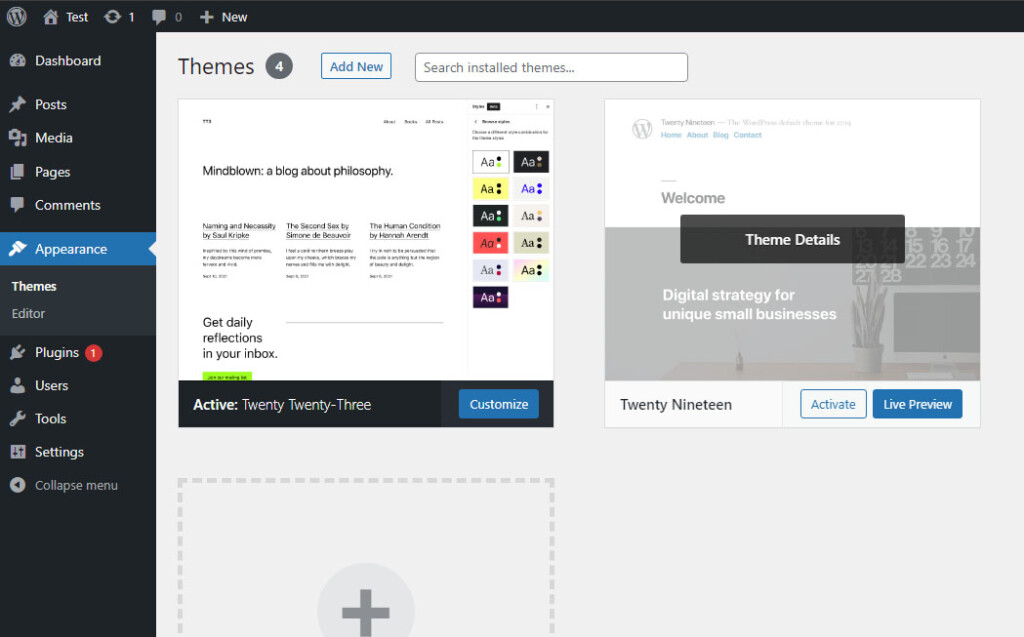 In the WordPress admin area, hover over Appearance in the left menu and then click on Themes. You'll see the TwentyNineteen template, which we will activate. You can start exploring new templates using the Install button next to the number of installed templates at the top left.