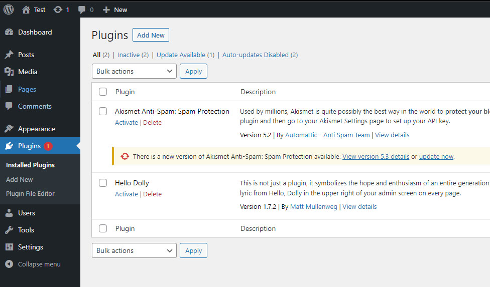Once you become familiar with the options that WordPress offers for creating posts and pages, you might start looking for additional tools and features that you want to have on your site. These extensions are provided by plugins. You can access the list of installed plugins through the Plugins item in the menu. After installing WordPress, you will see the Akismet Anti-Spam and Hello Dolly plugins in there (these are the plugins included in the basic WordPress installation).