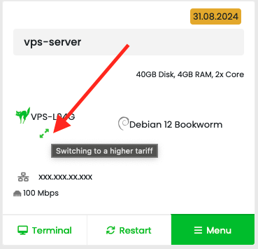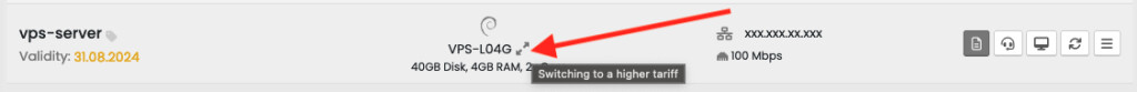 To switch to a higher tariff with VPS, use the double arrow icon next to the name of your current tariff with the label "Transition to a higher tariff" directly at the VPS in the administration of hosting services: