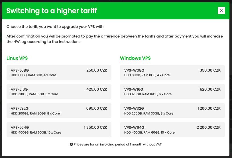 After confirming the order, the system send a call for payment to pay the amount according to the difference between the tariffs until the end of the current valid period of the VPS server. After payment, the VPS will be increased and you will receive a confirmation with the next procedure for loading the new tariff.