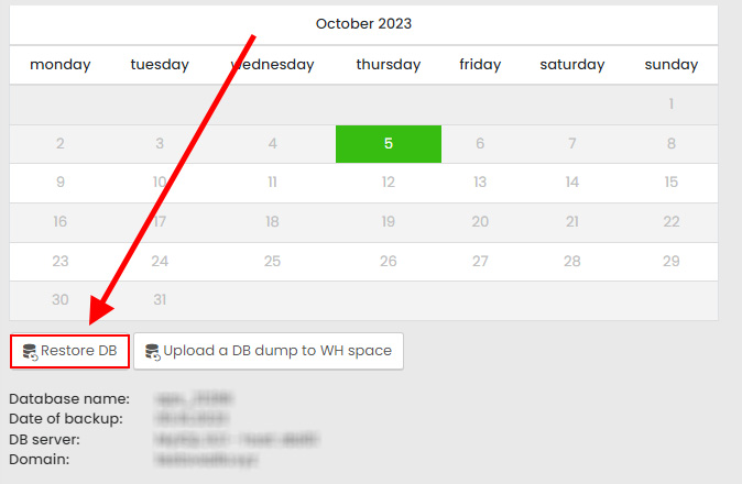 Select the date of the backup from the calendar and enter the "Restore DB" option. After the restore is complete, you will receive an informational email.