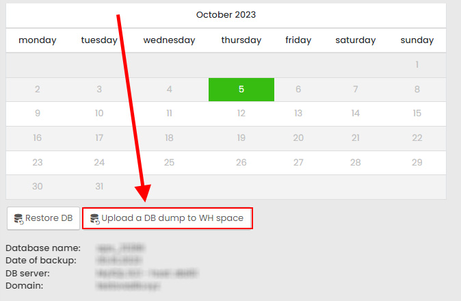 Choose the date of the backup from the calendar and enter the option "Upload a DB dump to WH space". The dump of the selected database will be uploaded to the _sql directory in the web hosting space within a few minutes.