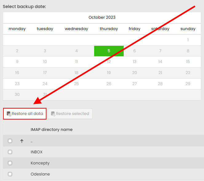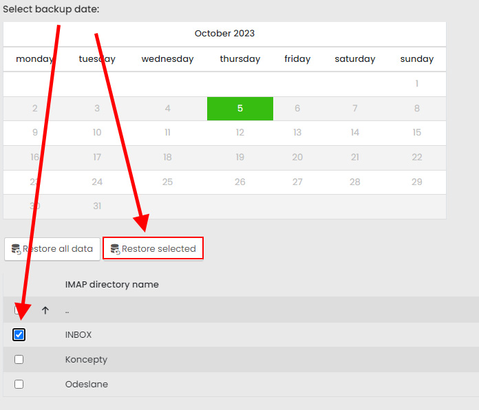 Choose the date of the backup created from the calendar, check the required IMAP directories and enter the option "Restore selected". You will receive an informational email when the restore is complete.
