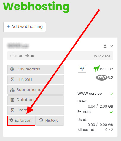 Login to the hosting services admin.hukot.net and go to edit your hosting service (applies to Webhosting, Wordpress Hosting, Multihosting and Wordpress Multisite).
