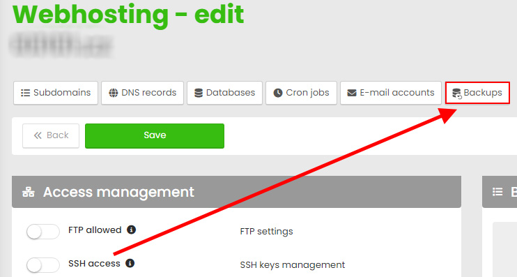 Within the administration, the user can restore the webhosting directly from the WH edit area, where you can browse the backup content and choose to restore the entire site or individual directories/files, or mount the selected backup as a whole in the _backup directory.