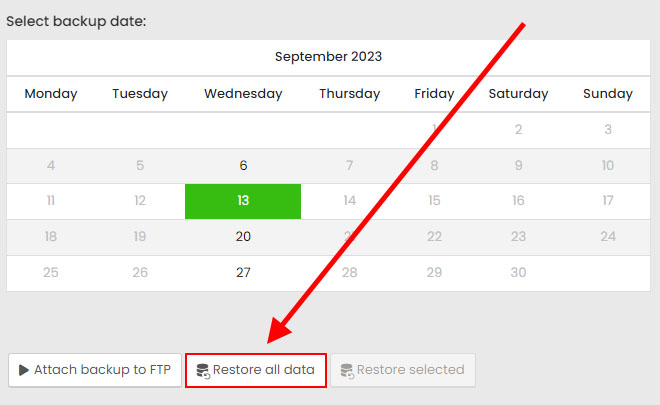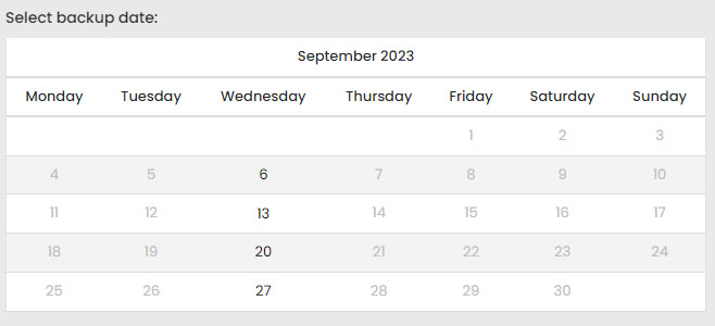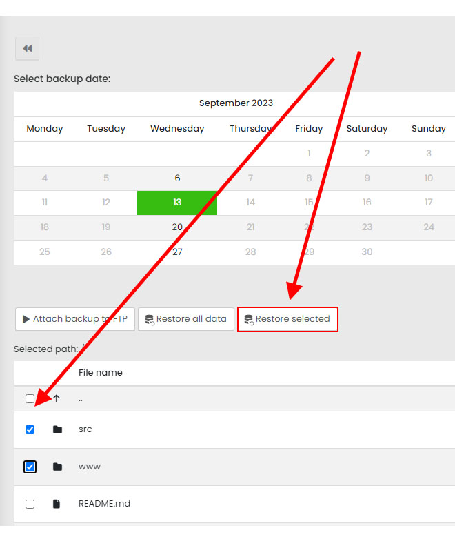 Choose the date of the created backup from the calendar, check the necessary files/folders from the directory structure and enter the option "Restore selected". You will receive an informational email when the restore is complete.