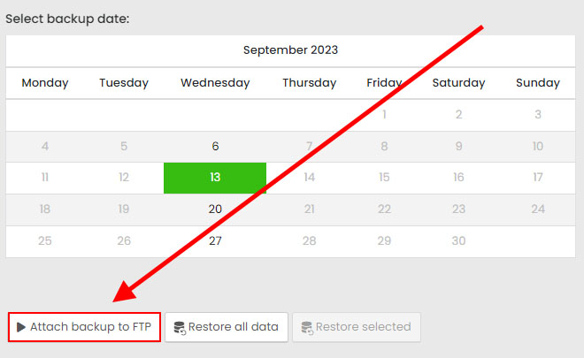 Select the date of the backup from the calendar and enter the "Connect backup to FTP" option. The selected backup will be mounted as a whole to the _backup directory in the web hosting space within a few minutes and you can then copy the files as needed, e.g. via FTP.