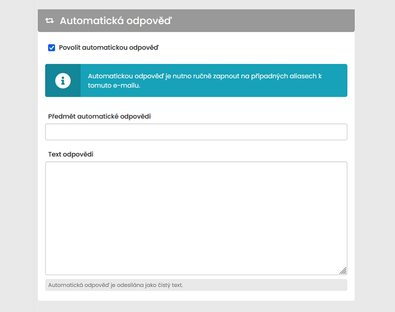 V editaci e-mailového účtu, zaškrtneme možnost Povolit automatickou odpověď.