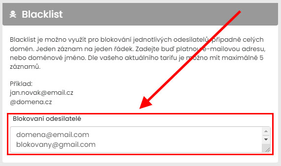 Blacklist je možno využít pro blokování jednotlivých odesílatelů, případně celých domén. Jeden záznam na jeden řádek. Zadejte buď platnou e-mailovou adresu, nebo doménové jméno. Maximální počet záznamů je dán vaším tarifem.