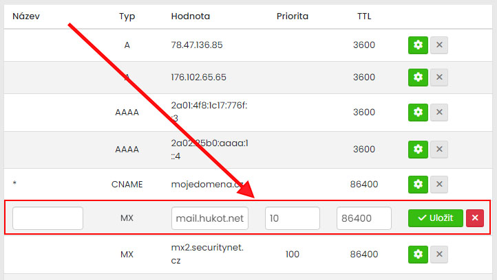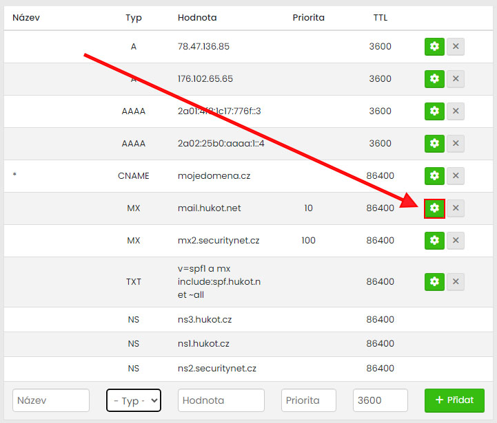 Přihlaste se do administrace hostingových služeb admin.hukot.net a přejděte do editace domény, DNS. Níže vidíte i ukázku, jak mají být jednotlivé DNS záznamy zadané.