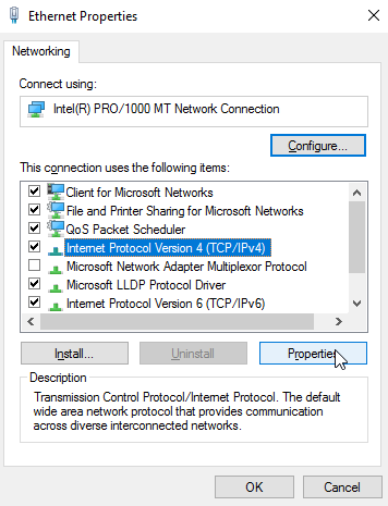 Vybereme Protokol IP verze 4 (TCP/IPv4) > Vlastnosti.