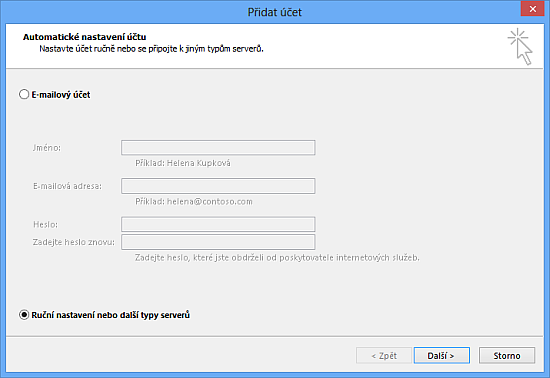Zaškrtneme možnost Ruční nastavení nebo další typy serverů a pokračujeme tlačítkem Další.