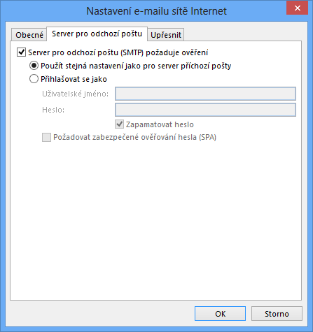 Na kartě Server pro odchozí poštu zaškrtneme možnost Server pro odchozí poštu (SMTP) požaduje ověření.