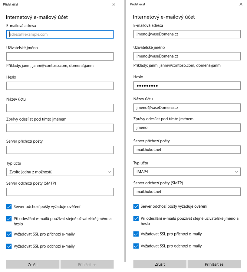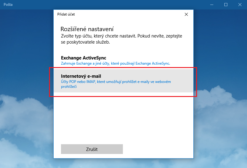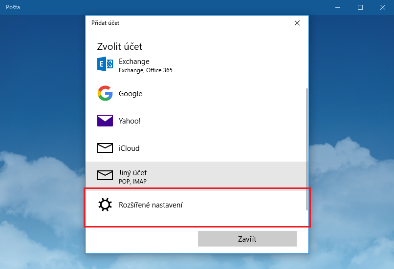 Jak nastavit e-mailovou schránku v poštovním klientovi Pošta - Windows 10 - IMAP