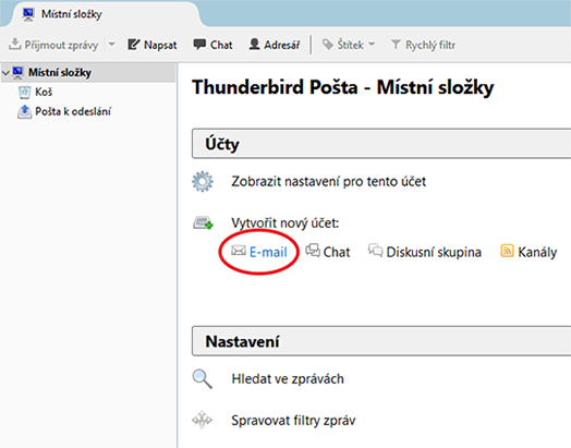 Pro používání klienta Thunderbird nejprve budeme muset vytvořit nový účet pro přidání e-mailové schránky.