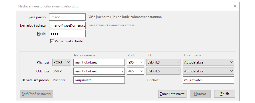 Tyto údaje nám budou zajišťovat připojení k e-mailovému serveru.