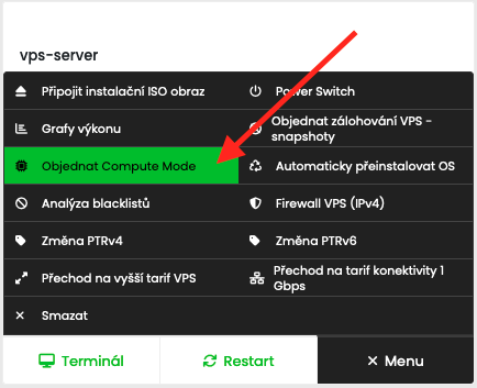Pro objednání doplňkové služby Compute mode k VPS využijte položku v menu "Objednat Compute mode" z nabídky v menu u vašeho VPS:
