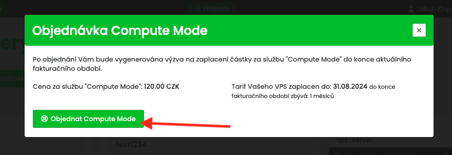 V rámci pop-up okna potvrdíme objednávku tlačítkem "Objednat Compute mode":