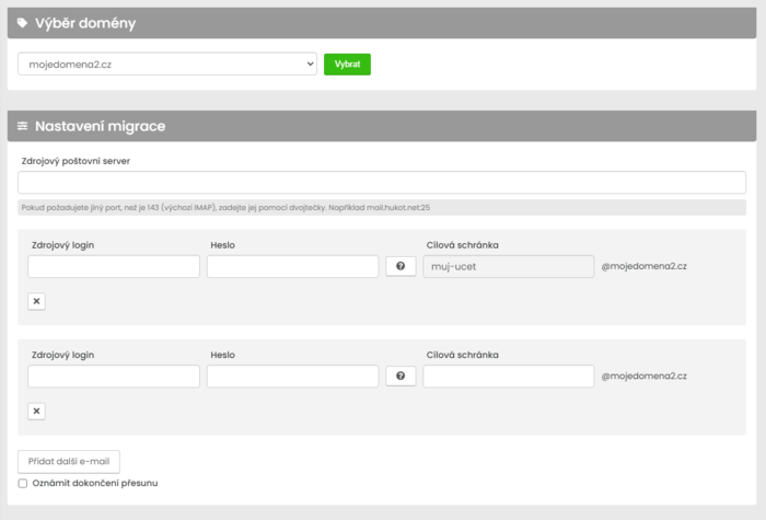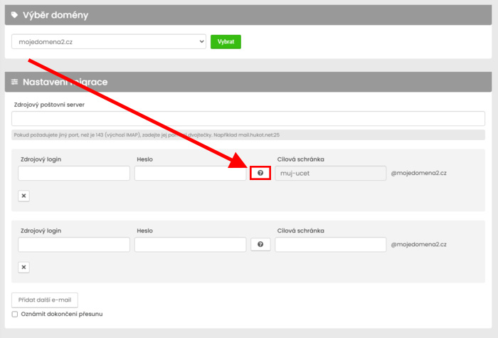 Po vyplnění e-mailových adres a hesel, můžeme spustit migrování pomocí tlačítka přidat další e-mail.