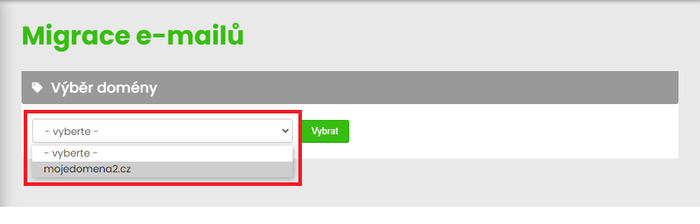 Z nabídky vybereme doménu pro kterou budeme e-maily migrovat.