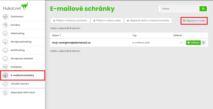 Z navigační nabídky vybereme E-mailové účty a přejdeme na záložku Migrace e-mailů.