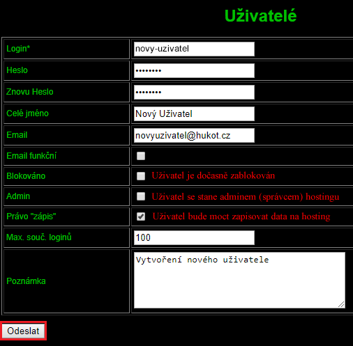 Údaje vyplníme a uživatele vytvoříme tlačítkem Odeslat.